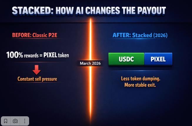 In March 2026, @Pixels launched "Stacked" — an AI reward infrastructure. Core change: part of player rewards now goes out in USDC, not PIXEL.