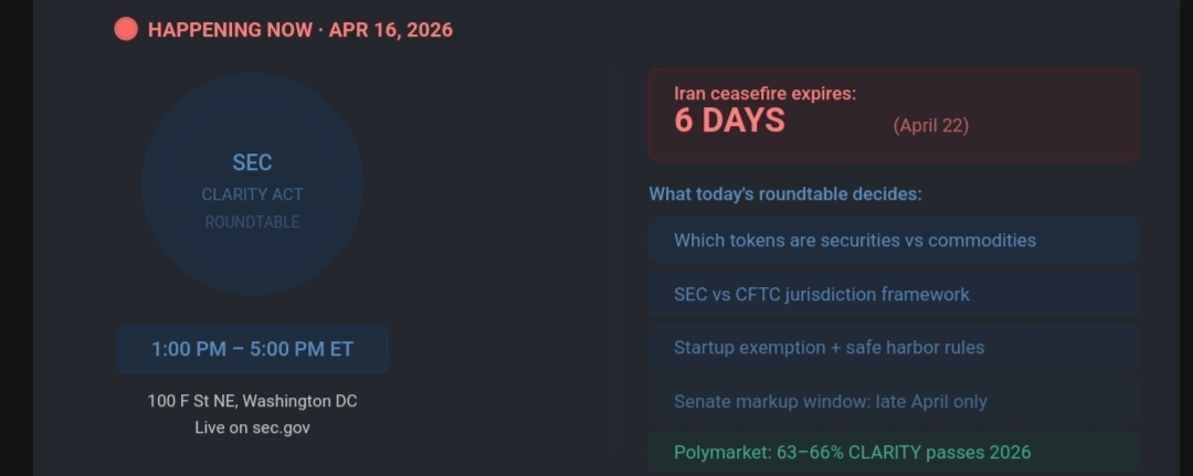 Today, April 16, from 1PM to 5PM Eastern Time, the SEC's Crypto Task Force is holding a public roundtable on the CLARITY Act at its headquarters in Washington DC. It's streaming live on SEC.gov. And the outcome of what gets discussed today will directly shape whether crypto finally gets a clear legal framework in America — or waits another two years.