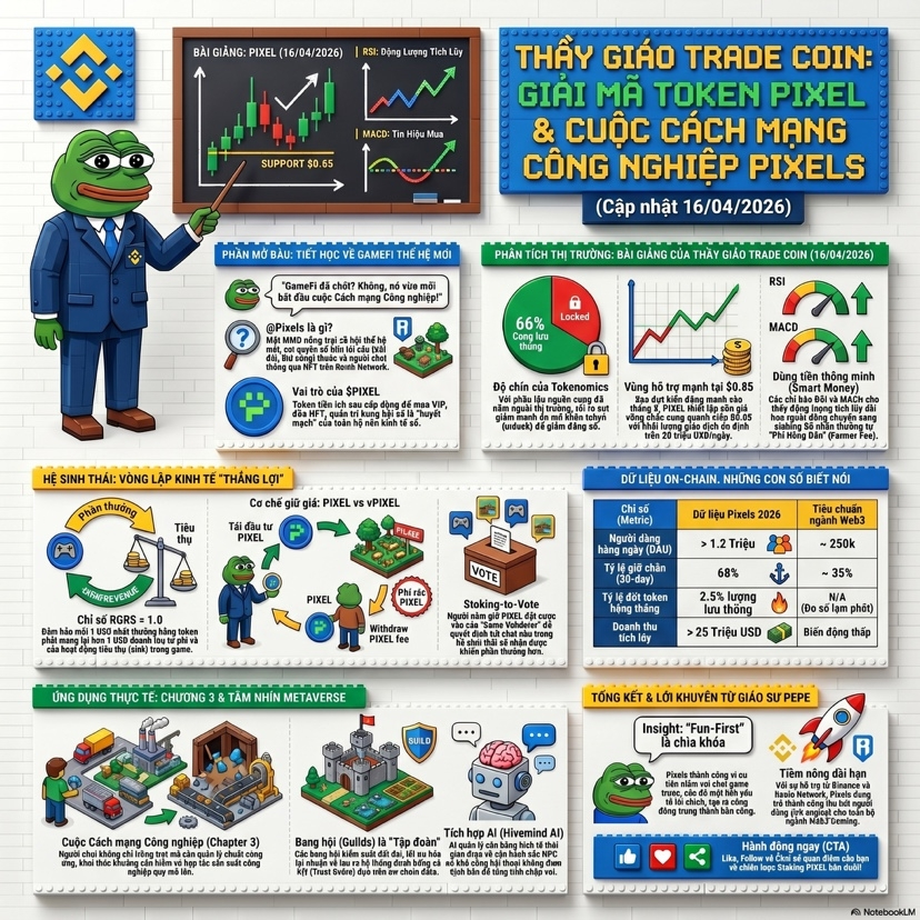 Về góc nhìn thị trường pixel hiện đang đi trong một cấu trúc tích lũy sau giai đoạn hype ban đầu Biểu đồ cho thấy vùng hỗ trợ đang được giữ khá ổn định chứng tỏ lực bán đã yếu dần Trong khi đó volume tuy không bùng nổ nhưng lại duy trì đều đây là dấu hiệu của dòng tiền thông minh đang âm thầm gom hàng