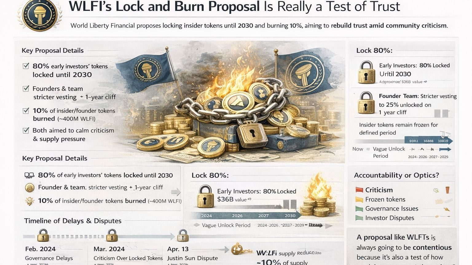 WLFI’s proposal to lock insider tokens and burn part of them is trending because it does not feel like a routine governance update and instead comes across as damage control mixed with a real attempt to steady the project after weeks of criticism. Reuters reported that World Liberty Financial wants early investors to keep 80 percent of their tokens locked until 2030 while founder and team allocations would face stricter vesting and a 10 percent burn under the new plan.