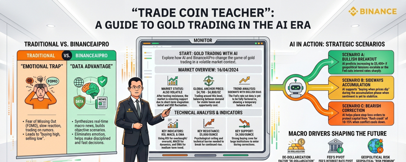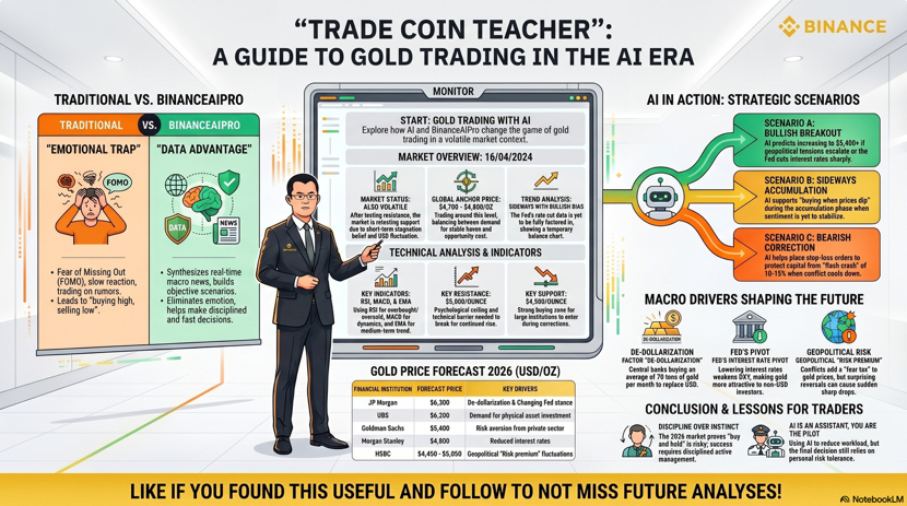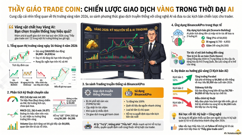 Anh em vào lệnh vàng mà tim đập nhanh hơn cả khi crush rep tin nhắn thì hôm nay bài này dành cho bạn Xin chào anh em mình là thầy giáo trade coin quay lại với một góc nhìn rất thật về thị trường vàng ngày 16 tháng 4 năm 2026 và cách mình đang kết hợp giữa trading truyền thống và BinanceAIPro để sống sót trong con sóng đầy nhiễu này