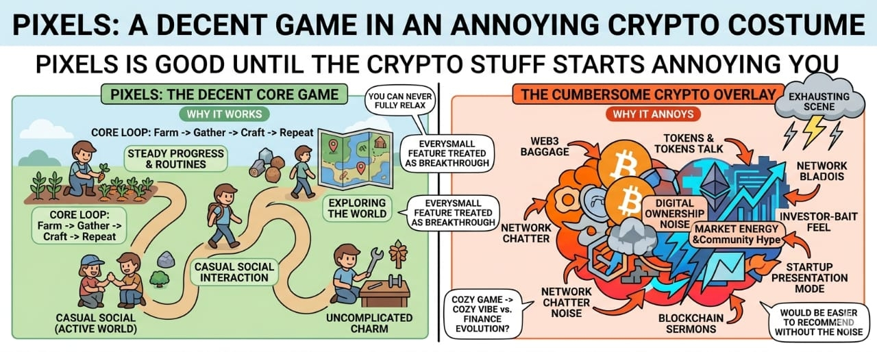 Dar lucrurile crypto continuă să se interpuna. Aceasta este adevărata problemă. Schimbă cum se simte totul. Un joc de agricultură normal poate fi doar un joc de agricultură. Pixels are mereu acest nor suplimentar deasupra lui. Nu poți vorbi despre el fără ca cineva să aducă vorba despre token, ecosistem, unghiul proprietății sau ceva altceva care sună ca și cum ar fi ieșit dintr-o prezentare de pitch. Îi afectează toată starea de spirit. Un joc confortabil ar trebui să se simtă confortabil. Nu ar trebui să se simtă ca o prezentare de startup cu culturi.