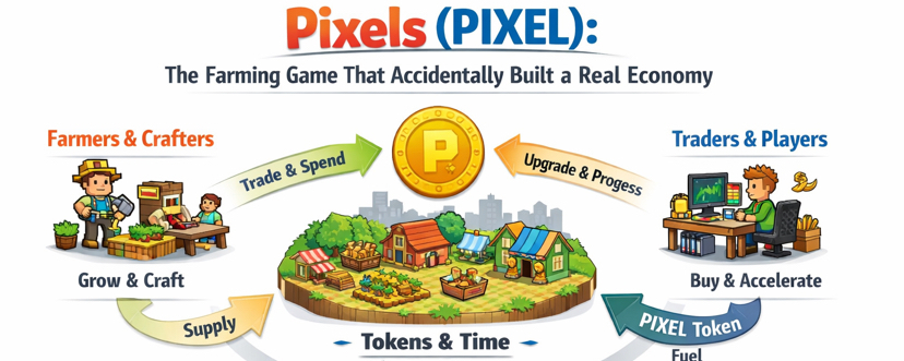 Pixels looks simple. You plant crops, harvest them, craft items, and explore a colorful world. But after spending time watching how players actually behave, it starts to feel less like a game and more like a small digital town trying to run its own economy.