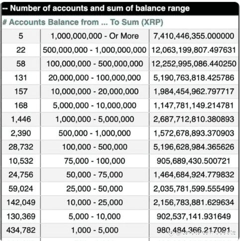 The upper end of the distribution reveals the primary reason behind the elevated average. Only five accounts hold at least 1 billion XRP, representing over 7.4 billion XRP collectively.
