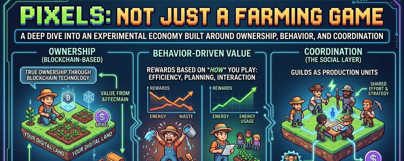 @Pixels There’s something slightly misleading about how simple Pixels looks at first. You log in, see crops, land, a few tasks to complete, and it almost feels like something you’ve already understood before even playing. Plant, wait, harvest, repeat. It carries that familiar rhythm that doesn’t ask much from you. But the longer you stay inside it, the harder it becomes to treat it like just another casual loop. A question slowly forms without really announcing itself — why does a game this simple need an economy at all? Not just a reward system, but something that feels structured, reactive, and oddly persistent. That’s when it starts becoming clear that Pixels isn’t really trying to impress you at the surface level. It’s trying to hold onto something deeper — your time, your patterns, and the way you choose to play.