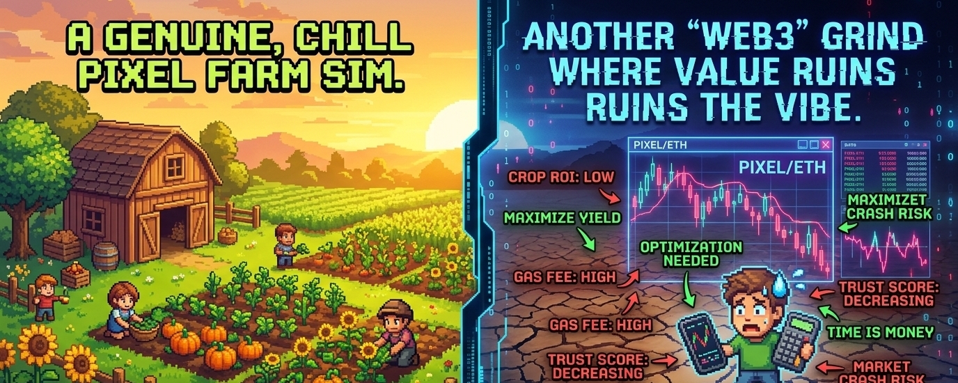Te încarci și da, arată relaxant. Fermă, plimbându-te, grafică pixelată, toate acele lucruri confortabile. Dar deja știi ce se află sub toate acestea. Tokeni. Economie. „Proprietate.” Toată treaba asta. Și odată ce acest gând îți lovește mintea, nu pleacă cu adevărat. Rămâne acolo în spatele minții tale, stricând în liniște vibrația.