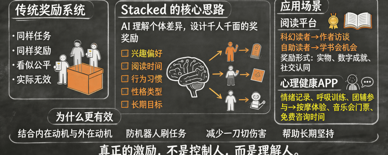 想象自己作为一个喜欢阅读的人,当你在阅读平台上完成一本书,系统并不会简单地给你发放一个“通用”积分,而是分析你阅读的时间段、偏好主题和阅读频率,再给你一个最能激发下一步行动的奖励。如果你喜欢科幻,它可能给你解锁一篇稀缺的作者访谈;如果你倾向于自助读物,则提供一次参与读书会的机会。奖励的形式也因人而异:有人喜欢实物礼品,有人喜欢数字成就,还有人喜欢社交认同。Stacked 的 AI 模块可以根据人的性格类型、日常行为和长期目标在背后做出这种判断。