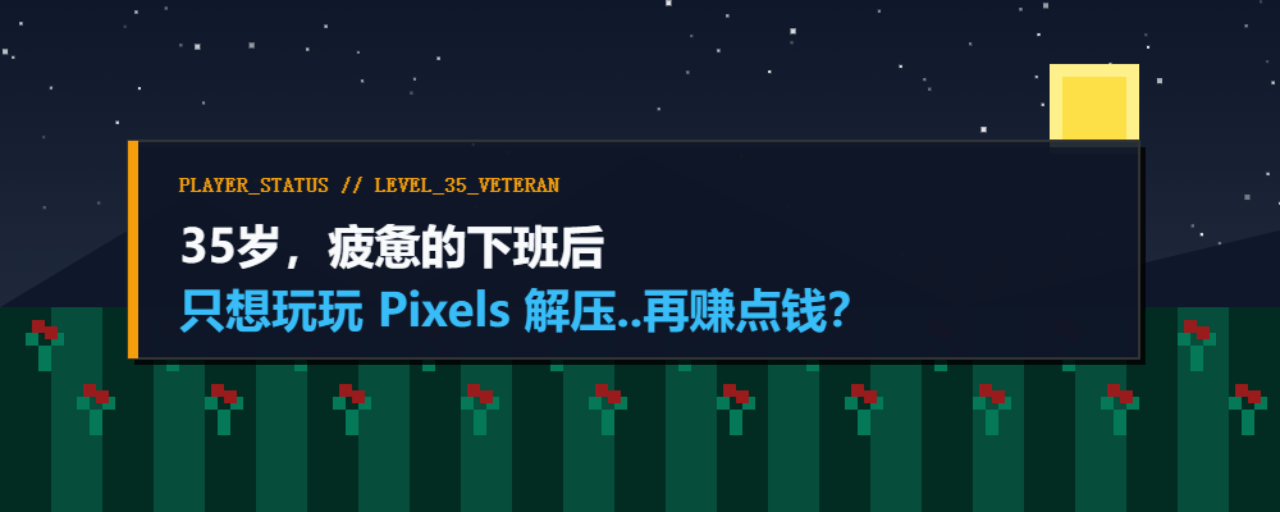 人到35岁,每天睁开眼就是工作和房贷,精力早就跟不上那些天天熬夜打金的年轻人了。我只有一个要求,轻松,写意,容易操作,刚看看到PIXELS的画风很对我胃口,由于对种菜有一定情怀,所以前阵子朋友拉我玩 @Pixels ,说实话,看着那一屏幕马赛克画风的种地小人,我心里是极其排斥和严重质疑的但又有一定的期待。