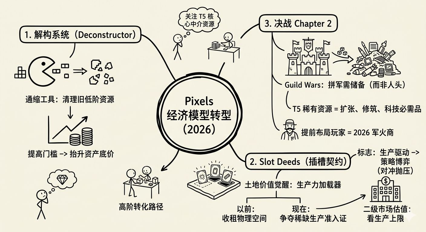 T5 引入的解构功能,是 Pixels 历史上最硬核的通缩工具。它允许玩家将低阶的、甚至过剩的旧资源拆解为高阶合成所需的原材料。