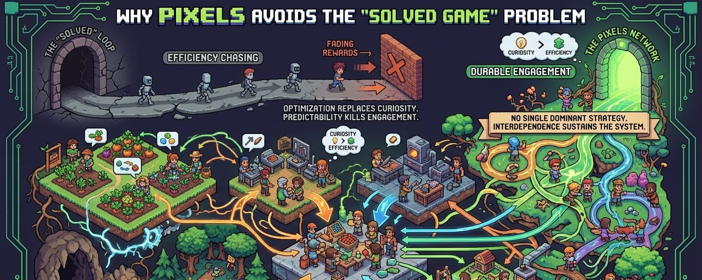 One of the less obvious consequences of this structure is how it affects motivation. In many reward-driven games, players start with exploration but gradually converge on efficiency. Once that convergence happens, curiosity fades. Pixels delays that collapse by keeping multiple viable paths alive at the same time, so exploration never fully stops being useful.
