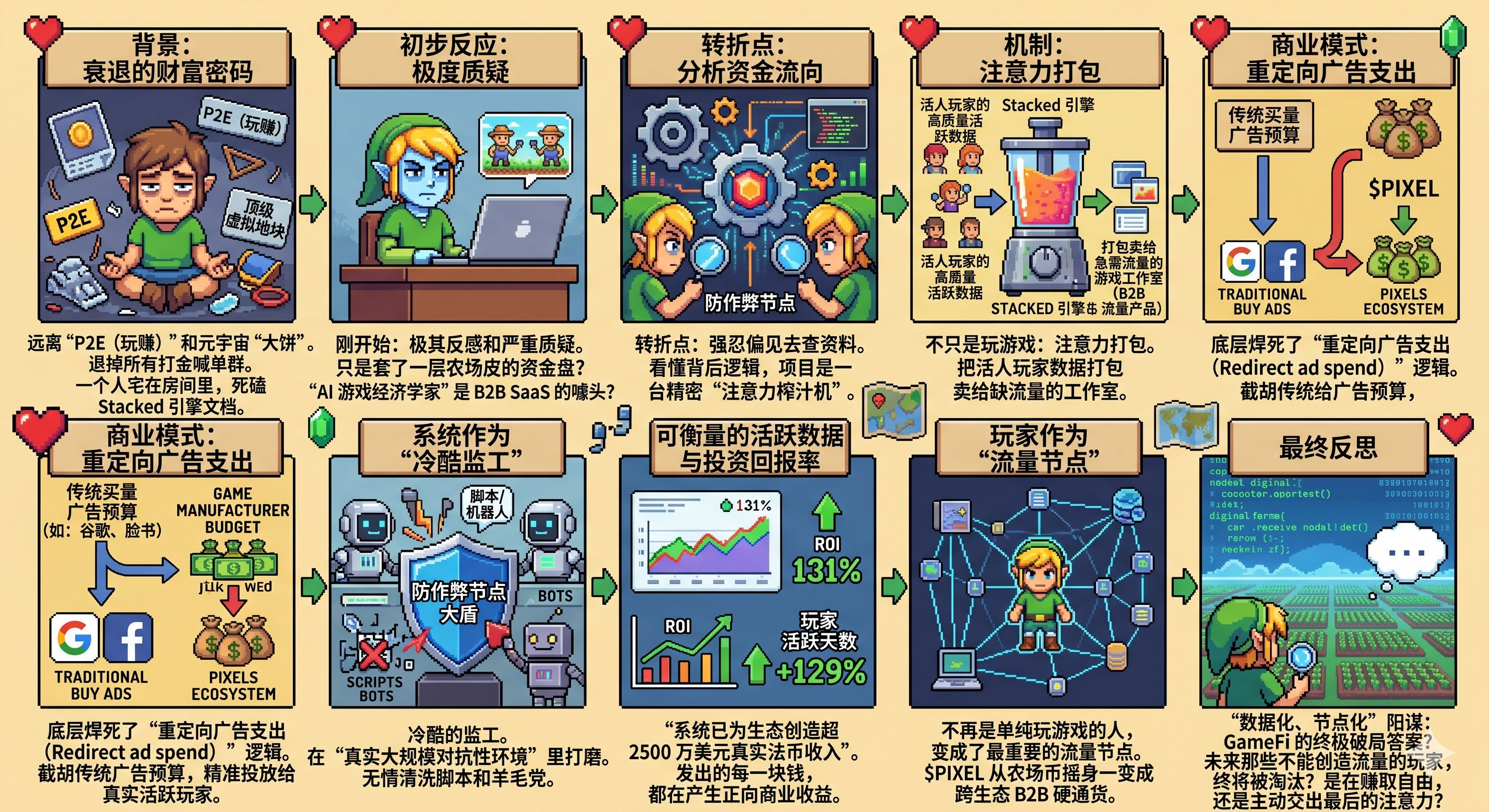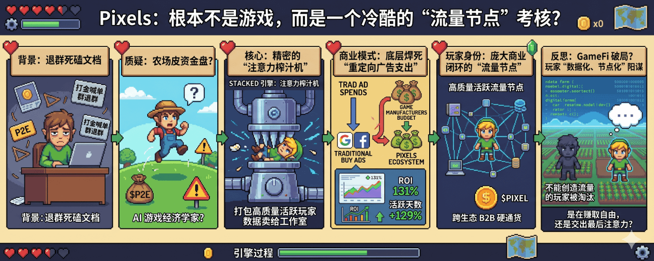 当整个 Web3 都还在靠发空气币画大饼的时候,像 Pixels 这样把我彻底“数据化、节点化”的阳谋,真的能成为 GameFi 最终极的破局答案吗?未来那些不能为生态创造真实流量的玩家,是不是终将被算法无情淘汰?在被代码精准计算的数字农场里,我究竟是在赚取自由,还是在主动交出我自己最后的注意力?别再跟我提什么理想主义了,在这个圈子里,清醒地活下去才是唯一的真理。