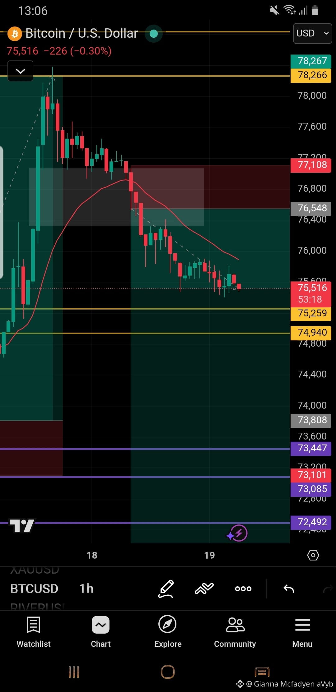 Dalam analisa pribadi saya, pergerakan yg terjadi sekarang lebih cenderung ke arah penurunan, area terdekat di $74k ada zona RBS. Selain faktor teknikal, kita jg harus memperhatikan faktor news/fundamental, ditambah dengan cuitan dari seorang yg berpengaruh di dunia crypto yaitu Trump. Jadi itu bisa menjadi faktor yg memperkuat penurunan untuk BTC. Untuk yg berdampak kenaikan drastis saya akan memilih $USOIL & $XAU , alasan utamanya karna ketegangan geopolitik di timur tengah dan penutupan selat hormuz yg menjadi area penting. Turut berduka jg untuk yang nyangkut di koin $RAVE , anda seharusnya belajar dari koin koin anomali yang di rugpull sebelumnya seperti Aria,aiot,sto dan Luna😂