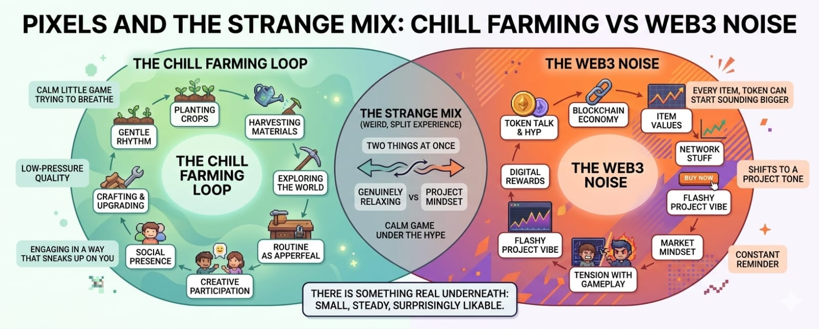 Așa că Pixels ajunge să pară ca două lucruri deodată. Este un joc social realmente relaxant cu un ciclu plăcut și o lume în care este plăcut să petreci timp. Și este de asemenea un produs Web3 care poartă tot bagajul care vine cu acel etichetă. Uneori cele două părți se potrivesc împreună. Uneori nu se potrivesc clar. Dar motivul pentru care oamenii continuă să vorbească despre Pixels nu este greu de înțeles. Nu este doar hype, chiar dacă hype este cu siguranță parte din pachet. Există ceva real sub asta. Ceva mic, stabil și surprinzător de plăcut. Nu perfect. Nu revoluționar. Doar captivant într-un mod care te surprinde.
