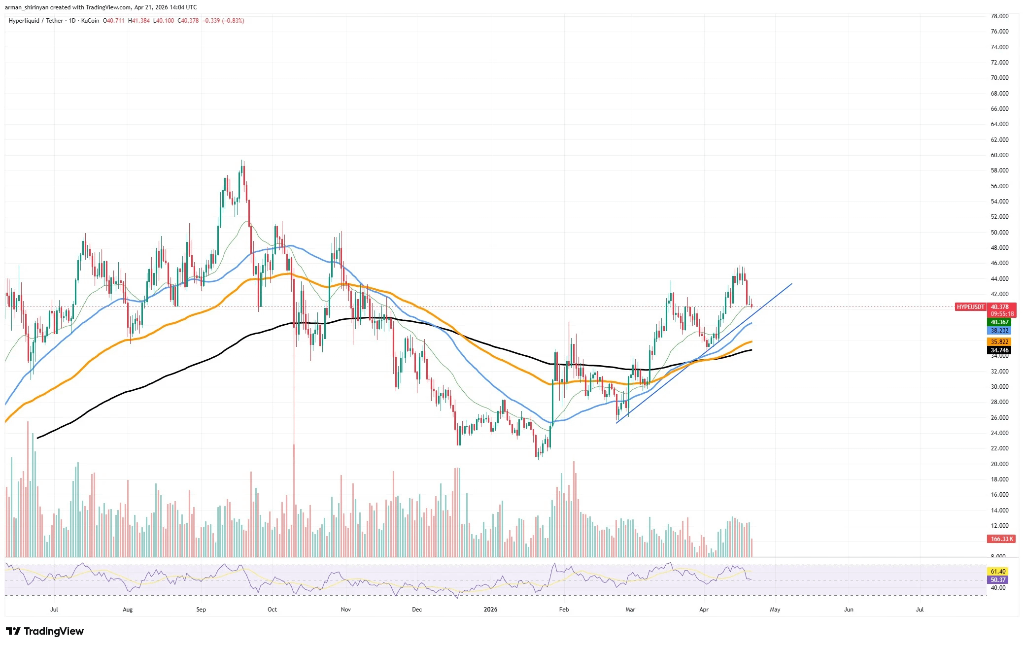 Since its local bottom earlier this year, HYPE has developed a rising structure on the chart that is backed by an ascending trendline. Price hasn't disrupted that structure despite the recent rejection near $45. Rather, it is consolidating slightly above the $40 area, which is currently serving as a short-term level of support rather than resistance.