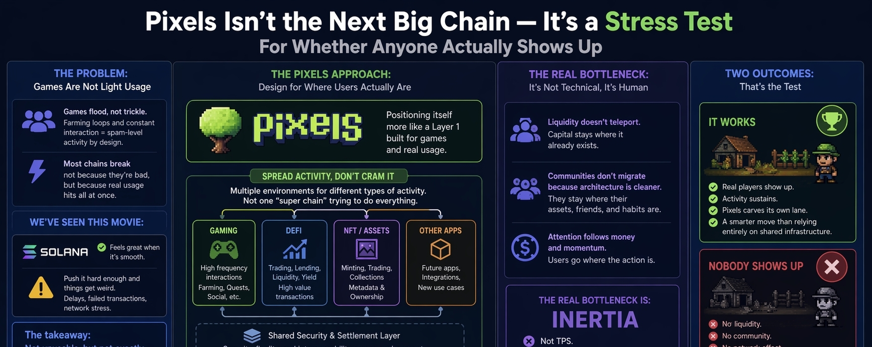 Games are different. They don’t trickle users in. They flood. If Pixels actually works the way it wants to, with farming loops and constant interaction, that’s not light usage. That’s spam-level activity by design. And most chains don’t break because they’re “bad.” They break because real usage shows up all at once and nobody planned for it.