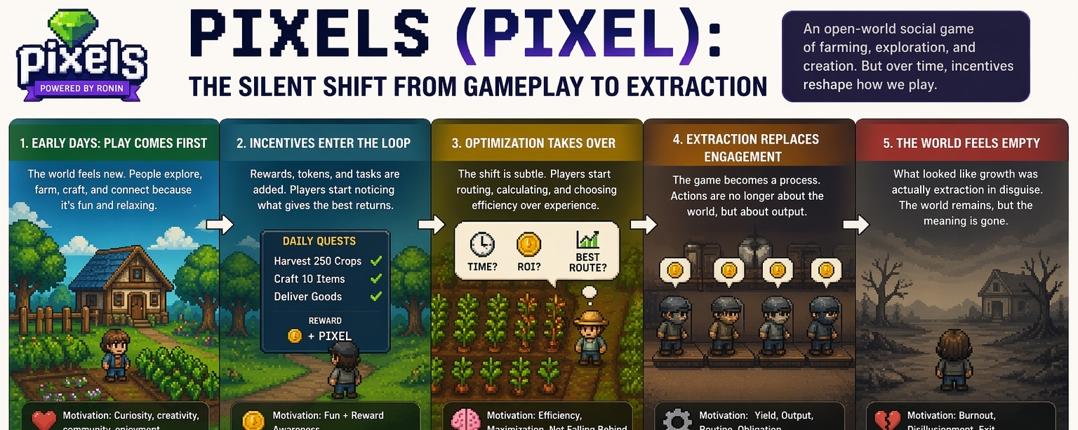 PIXELS At first, everything still looked like engagement. Players were farming, crafting, moving through spaces that felt alive in a casual way. There was repetition, but it didn’t feel heavy yet. The shift was subtle. Over time, I started to notice that actions weren’t always being chosen because they were interesting or satisfying. They were being chosen because they were efficient. That’s usually the first quiet signal that something deeper is changing in a system like this.
