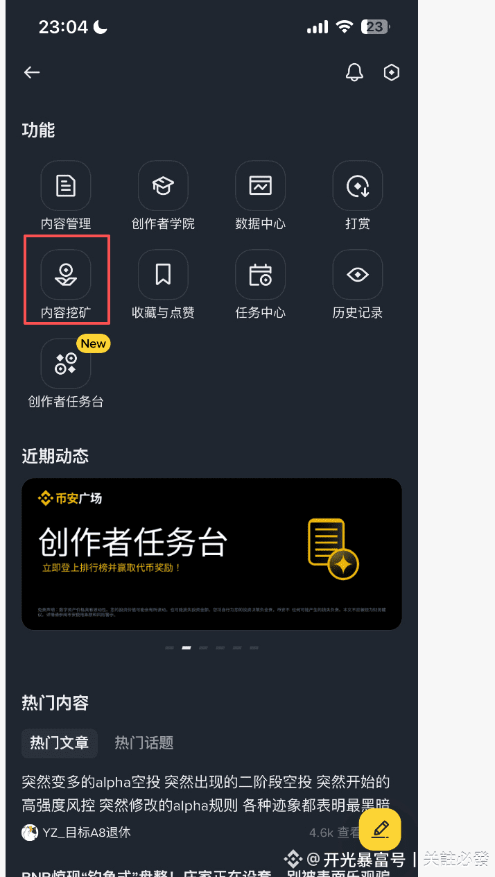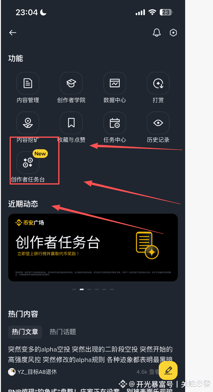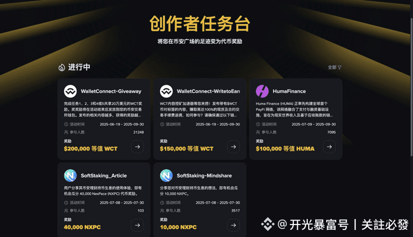 找到创作者任务台,点进去做项目方任务,获取空投,前期先熟悉流程,后期往前一百名冲刺,获取更多空投