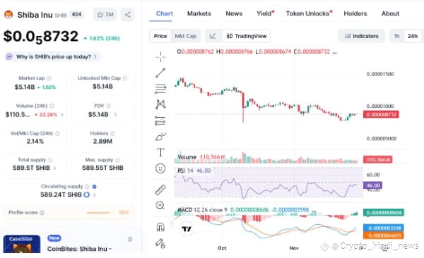 Shiba Inu ($SHIB ) पिछले 24 घंटों में 1.62% की बढ़त के साथ लगभग $0.000008732 स्तर पर ट्रेड कर रहा है। हालिया प्राइस मूवमेंट और इसके सपोर्ट–रेसिस्टेंस ज़ोन दिखाते हैं कि निकट भविष्य में कीमत में और वृद्धि की संभावना बन रही है।