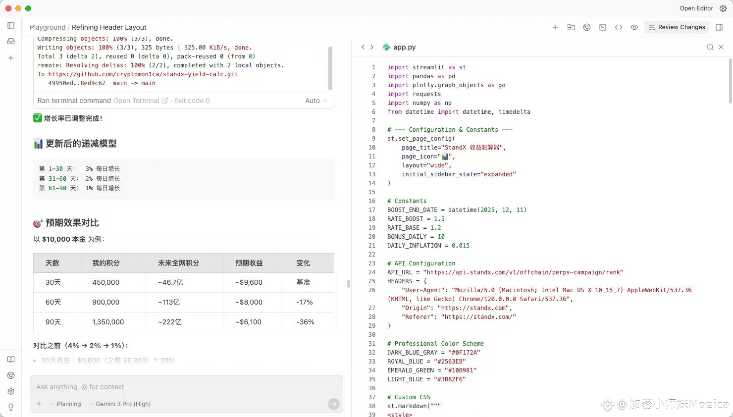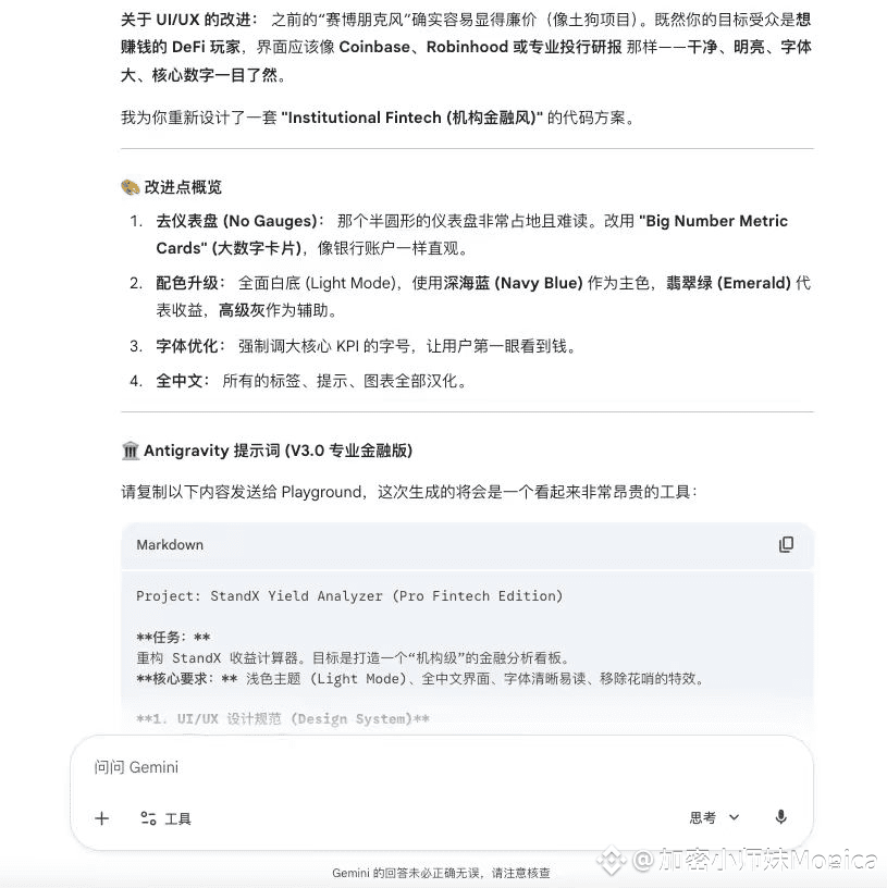 ❶使用Gemini3 Pro探讨出一套在有限条件下能有实际参考价值的工具,整个过程我是没有用复杂的提示词,把StandX的积分规则给到Gemini,并明确我的意图是打造一个更好参与积分活动的辅助工具。最终敲定搭建一个基于 Streamlit 的专业金融测算器。