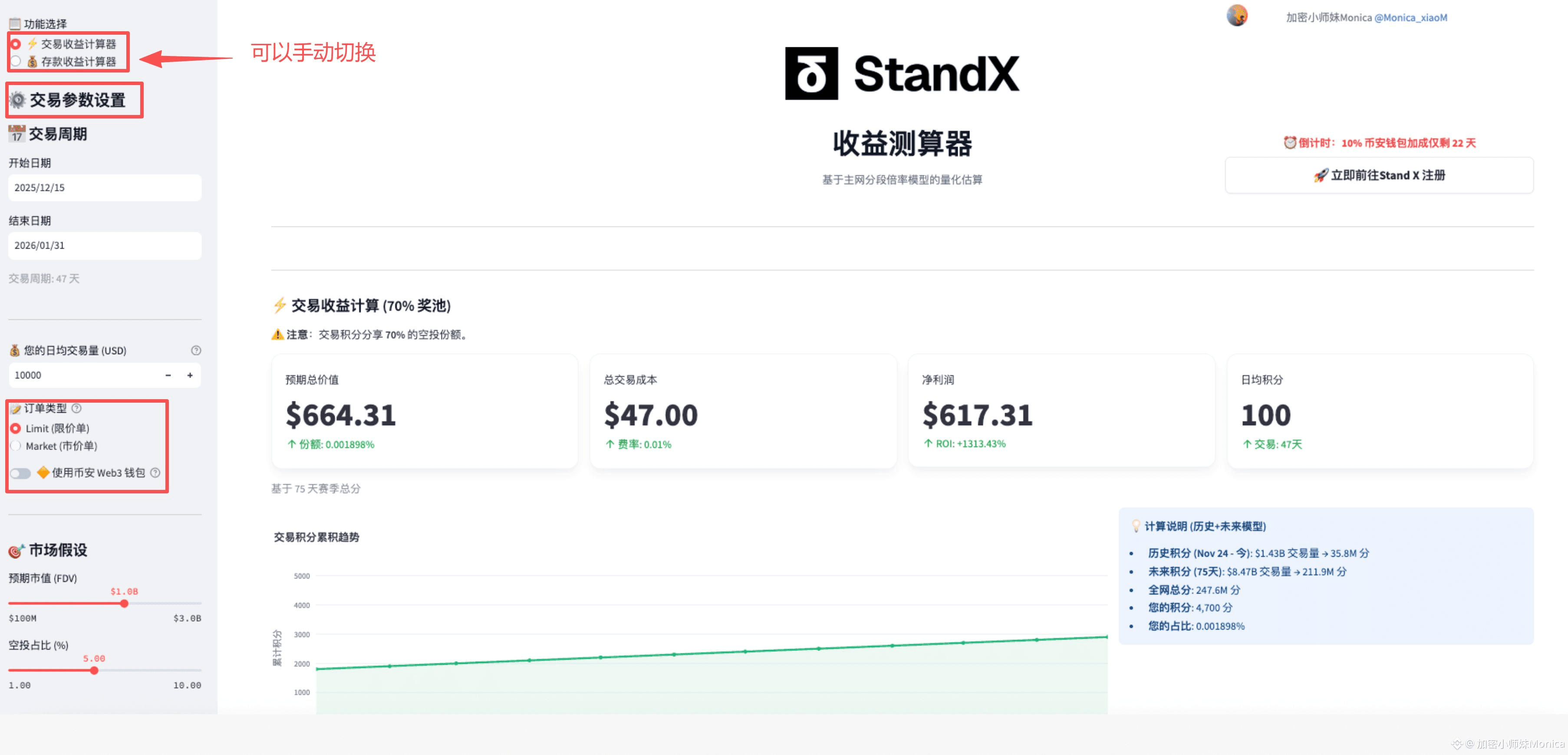 花费了一整个周末的时间,我们的空投收益计算器2.0版本随着StandX的主网交易积分上线,迎来了重大升级,更直观、更科学、更清晰!