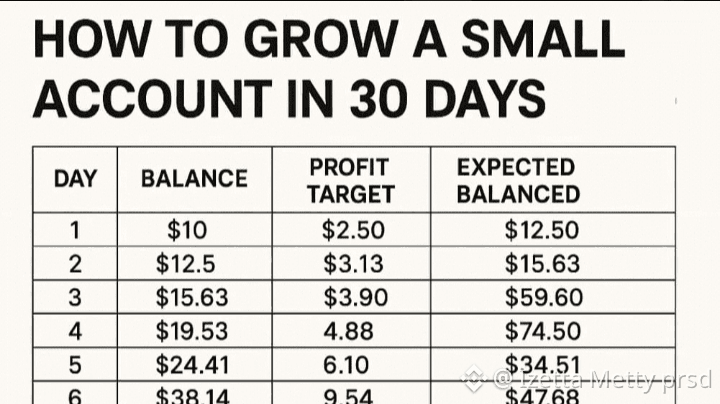 * **Calculații incorecte:** De exemplu, în Ziua 3, soldul inițial este de $15.63. Cu un profit de $3.90, totalul real ar trebui să fie $19.53. Totuși, tabelul arată incorect **$59.60**.
