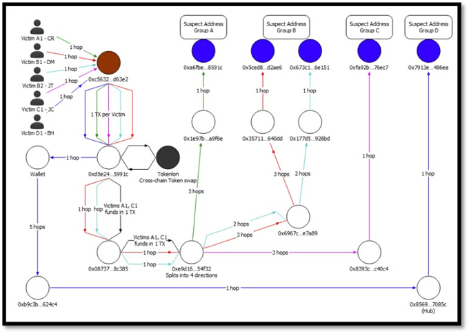 În primul rând, accentul crescut al Departamentului de Justiție asupra confiscărilor de criptomonedă crește șansele ca utilizatorii nevinovați să aibă monedele lor prăfuite în rețea. Multe confiscări de criptomonedă se bazează pe inferențe trasate de investigatorii guvernamentali din blockchain-uri publice și alte înregistrări de tranzacții. Iată un exemplu de analiză preluat dintr-un dosar judiciar al Strike Force, care arată transferul presupus al fondurilor obținute fraudulos prin numeroase portofeluri: