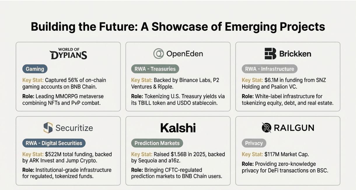 These emerging projects represented BNB Chain's strategic expansion beyond DeFi into gaming, RWAs, privacy, and regulated prediction markets. Combined funding exceeded $2 billion in 2025, with institutional investors like Sequoia, a16z, and ARK Invest signaling confidence in BNB Chain's infrastructure maturity. The diversity of sectors (gaming metaverses, Treasury tokenization, prediction markets, privacy tools) indicated the ecosystem's evolution toward comprehensive Web3 functionality beyond its trading-focused origins.
