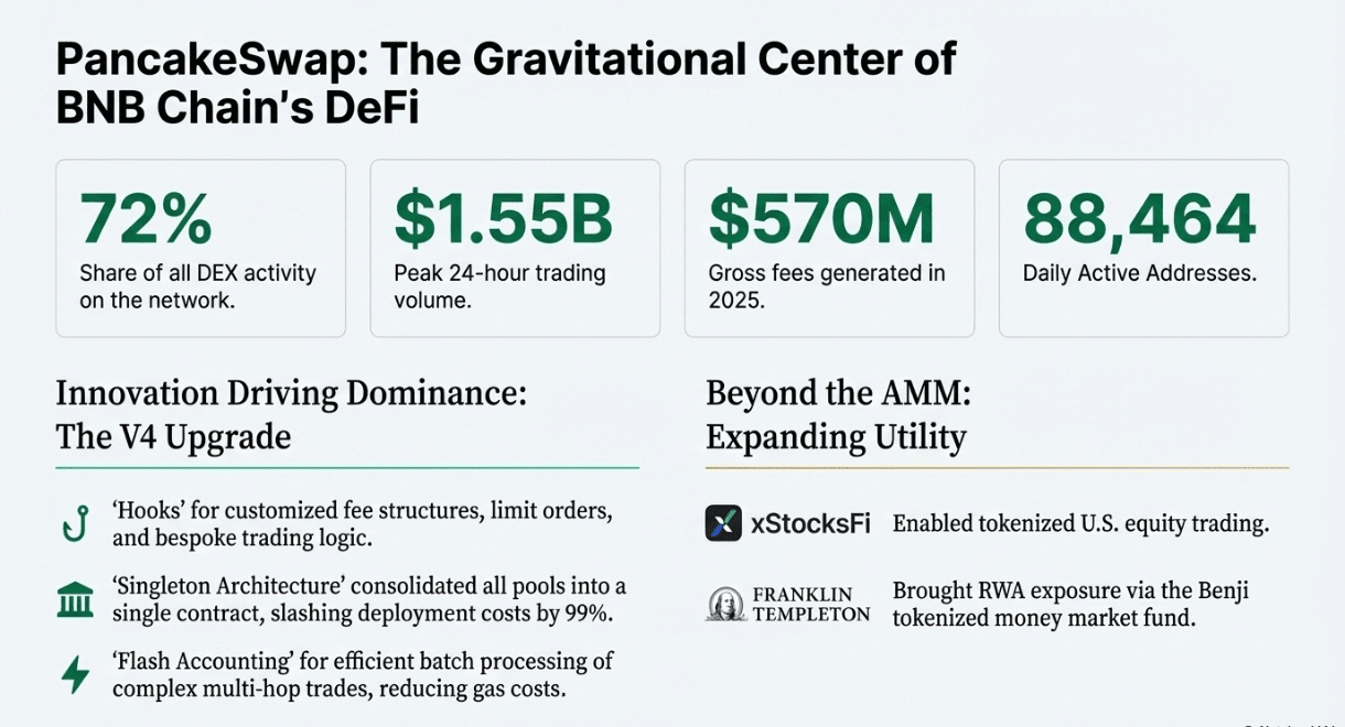 The V4 upgrade introduced hooks for customized fee structures and trading logic, singleton architecture that reduced deployment costs by 99%, and flash accounting for batch transaction processing. Strategic partnerships expanded PancakeSwap's utility beyond pure trading. The xStocksFi integration in July 2025 enabled tokenized U.S. equity trading directly through the DEX interface. A September partnership with Franklin Templeton brought real-world asset exposure via the Benji tokenized money market fund.