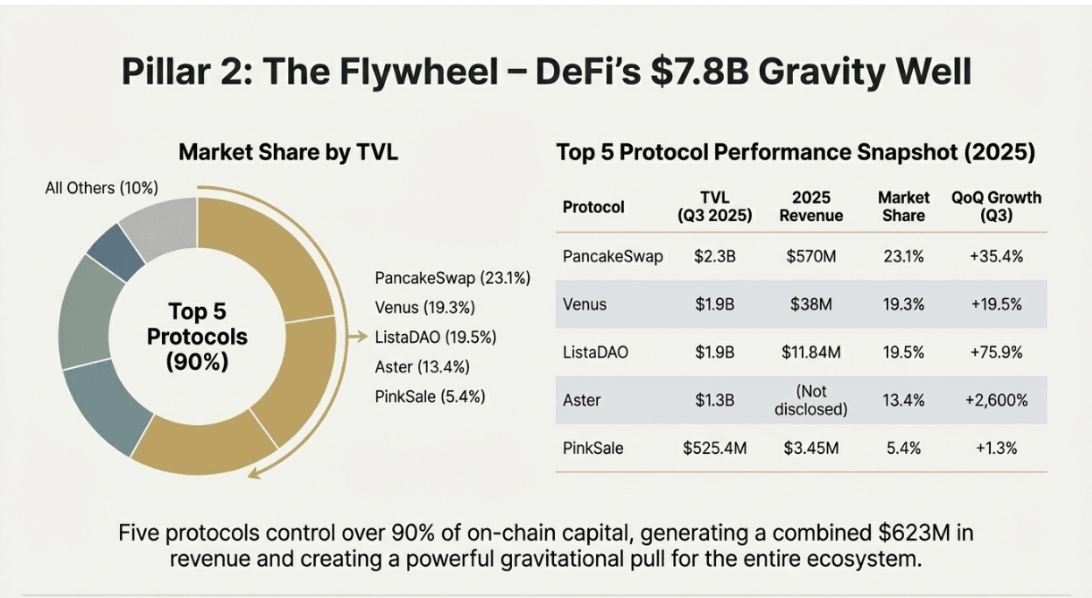 BNB Chain's DeFi ecosystem generated $7.8 billion in total value locked by Q3 2025, driven by five protocols that collectively controlled over 90% of on-chain capital. The sector's growth trajectory accelerated quarter-over-quarter, from 14% in Q2 to 30.7% in Q3, powered by innovations in automated market making, perpetual trading, and liquid staking derivatives.