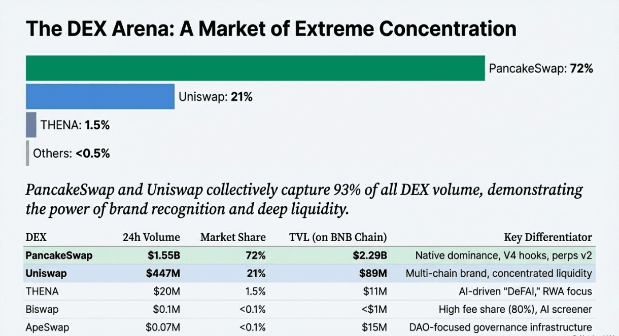 The DEX landscape on BNB Chain showed extreme concentration, with PancakeSwap commanding nearly three-quarters of all trading activity. Uniswap's strong second-place position reflected brand recognition and Ethereum trader migration seeking lower fees. THENA, Biswap, and ApeSwap collectively controlled less than 2% of market share, indicating the difficulty of competing against entrenched market leaders even with innovative features.