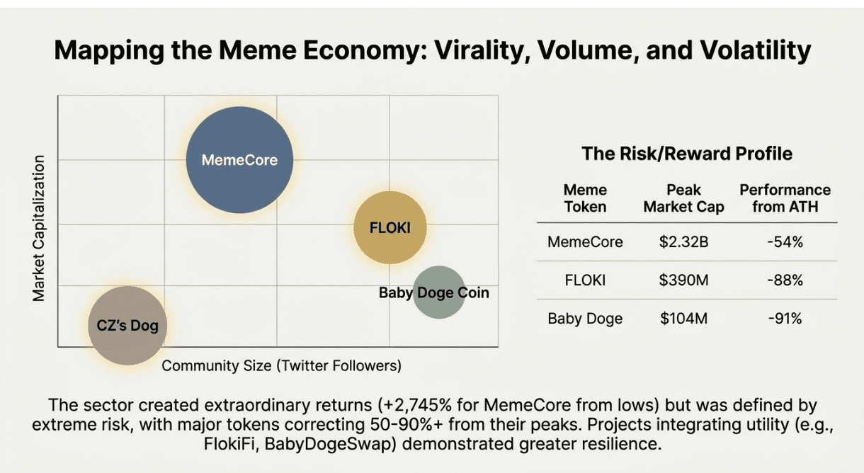 The meme sector on BNB Chain showed extreme risk-reward dynamics, with massive returns for early participants offset by 50-90% corrections from all-time highs. Projects attempting utility integration (FLOKI, Baby Doge) demonstrated better community retention than pure speculation plays. The Four.meme platform lowered barriers to meme token creation, potentially saturating the market and fragmenting liquidity across hundreds of low-quality projects.