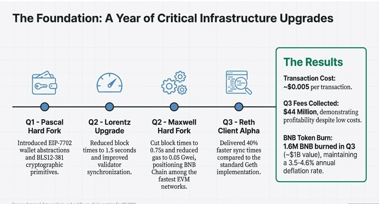 Infrastructure improvements drove much of this performance. The Pascal hard fork in Q1 introduced EIP-7702 wallet abstractions and BLS12-381 cryptographic primitives. The Lorentz upgrade in April reduced block times to 1.5 seconds and improved validator synchronization. Maxwell followed in June with the 0.75-second block time that positioned BNB Chain among the fastest EVM-compatible networks. By September, the Reth client alpha delivered 40% faster sync times compared to the standard Geth implementation.