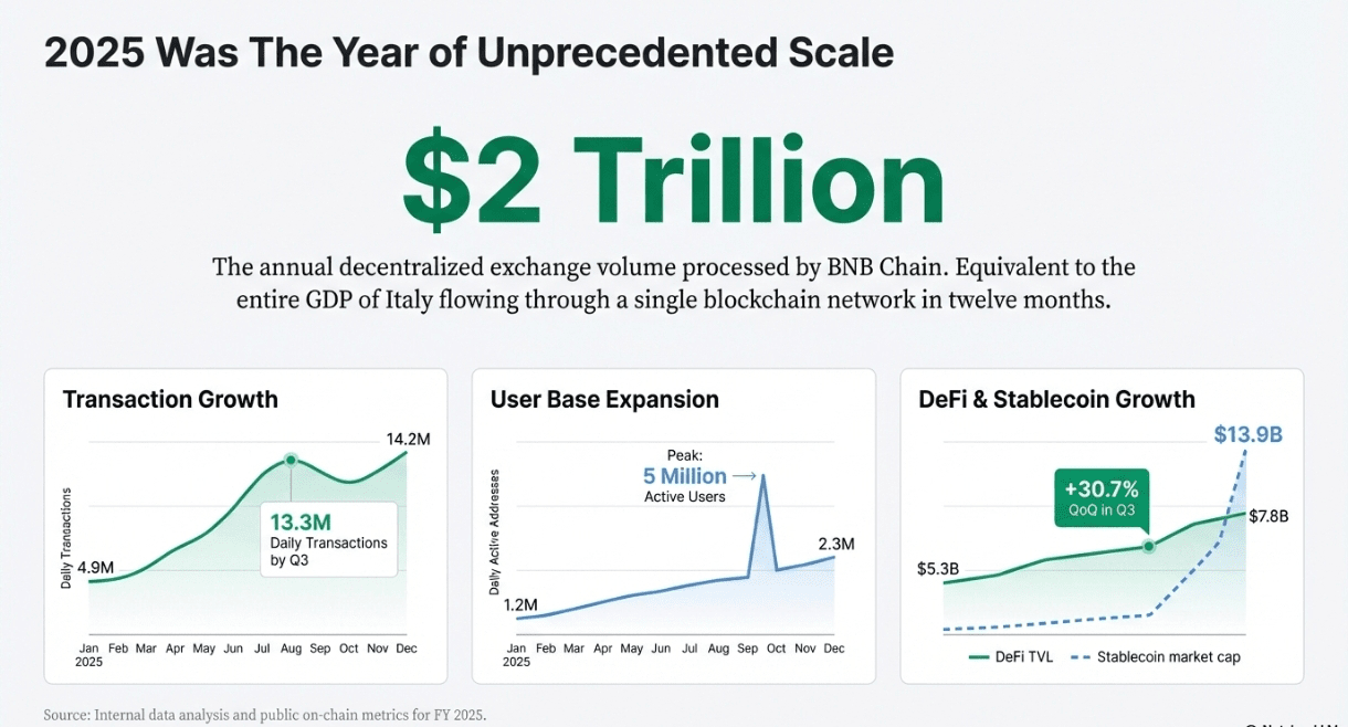 BNB Chain processed $2 trillion in Dex volume during 2025. To put that in perspective, that's roughly equivalent to the entire GDP of Italy flowing through a single blockchain network in twelve months. The number alone tells a story of extraordinary adoption, but the mechanics behind it reveal something deeper about how BNB Chain evolved from a trading-focused layer one into a comprehensive Web3 infrastructure.