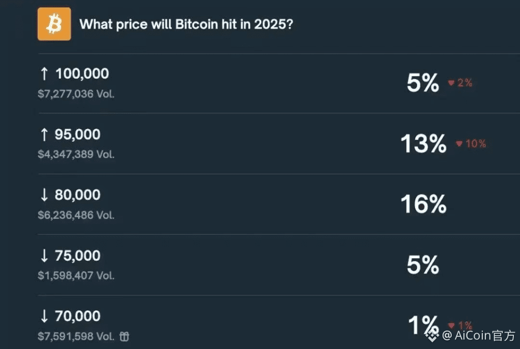 ● 与此同时,“比特币在2025年底前再次涨至10万美元”的概率同样仅为5%。而在12月23日,这一概率为8%,同时“再次涨至9.5万美元”的概率为25%。