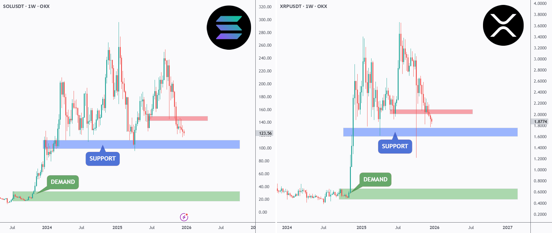 ⚔️Atât SOL cât și XRP se află acum într-o zonă majoră de suport săptămânal, marcată clar cu albastru. Aceasta nu este doar un nivel aleator, ci o zonă structurală cheie care a definit direcția în trecut.
