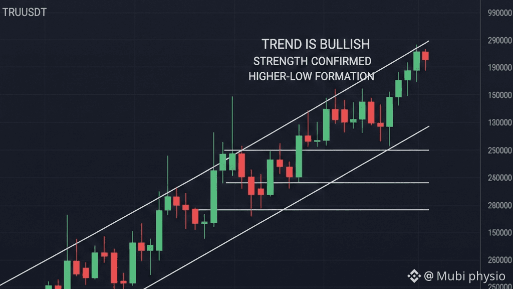 $TRU TRU continuă să afișeze o structură de piață bullish de tip manual, iar acțiunea prețului rămâne extrem de constructivă. Graficul arată o secvență clară de mișcări impulsive puternice urmate de retrageri sănătoase și controlate—exact pe baza cărora se construiesc tendințele ascendente susținute.