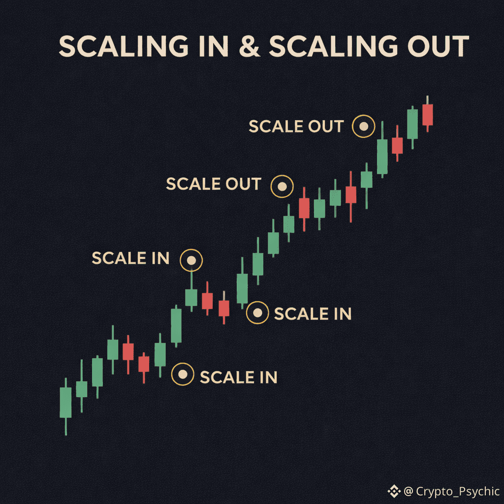 Scaling in refers to building a position gradually rather than committing full size at once. Scaling out means reducing exposure in stages instead of exiting all at a single price. Both approaches acknowledge a fundamental truth of markets: no trader knows the exact top or bottom. Price moves in phases, not absolutes, and position management should reflect that reality.