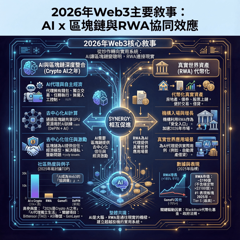 Verificare încrucișată a datelor (din postările X de la sfârșitul anului 2025) • Legat de AI: postările cu cele mai multe like-uri (peste 20) menționează direct „Anul 2026 al agentului AI” sau „Infrastructură AI x Crypto”, cu un număr total de like-uri în mii. DePIN + AI (de exemplu, partajarea GPU-urilor) a fost de asemenea prezentat ca fiind în curs de a deveni mainstream. • Legat de RWA: peste 15 postări discută tendința de tokenizare, datele de piață arătând o valoare de piață de aproximativ 1,9 miliarde (fără stablecoin), cu cea mai mare creștere în 2025. În clasamentul de tip Tier List, RWA este clasat S (cel mai înalt nivel). • Alte narative: discuțiile despre DePIN/GameFi sunt mai puține, iar performanța din 2025 a fost slabă (scădere cu peste 70%). Piețele de predicție și confidențialitate sunt, de asemenea, populare, dar nu la nivelul AI/RWA. • Consens general: mai multe instituții de investiții (cum ar fi Gate Ventures) prevăd pentru 2026, subliniind faptul că AI va deveni „stratul de coordonare” pentru web3, iar RWA va aduce lichiditate reală.