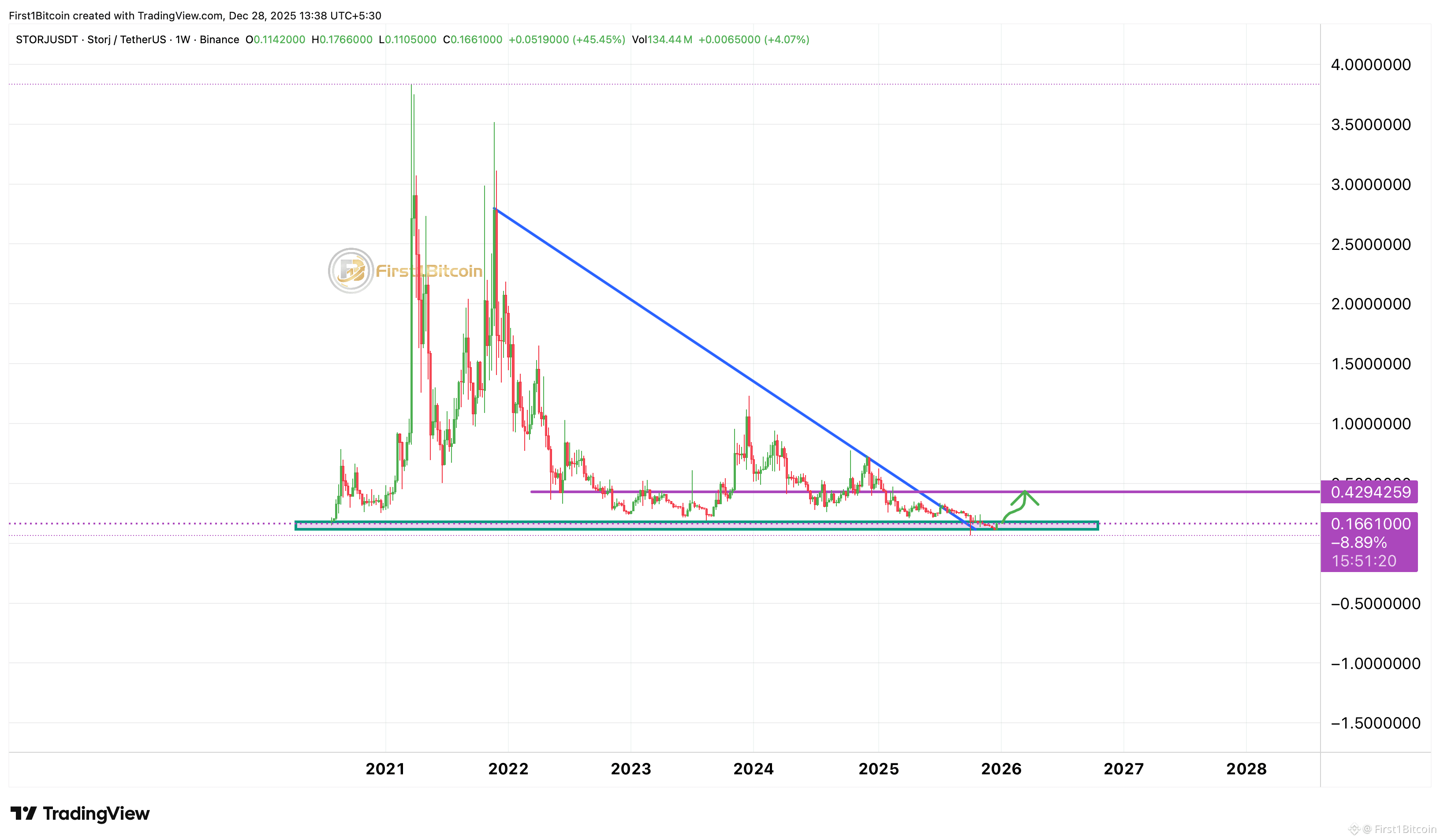 #STORJ has spent years in a steady downtrend, but price is now sitting on a major historical demand zone while pressing against a descending trendline.