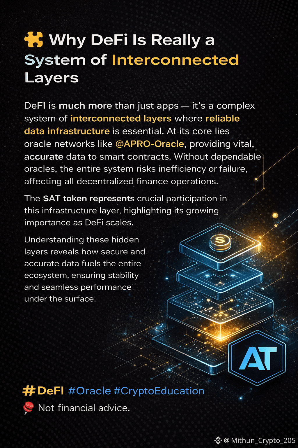 Decentralized finance is often explained through individual applications — exchanges, lending platforms, or yield strategies. But beneath these visible products lies a complex system of interconnected layers. One of the most critical of these layers is the oracle infrastructure, where projects like @APRO-Oracle operate.