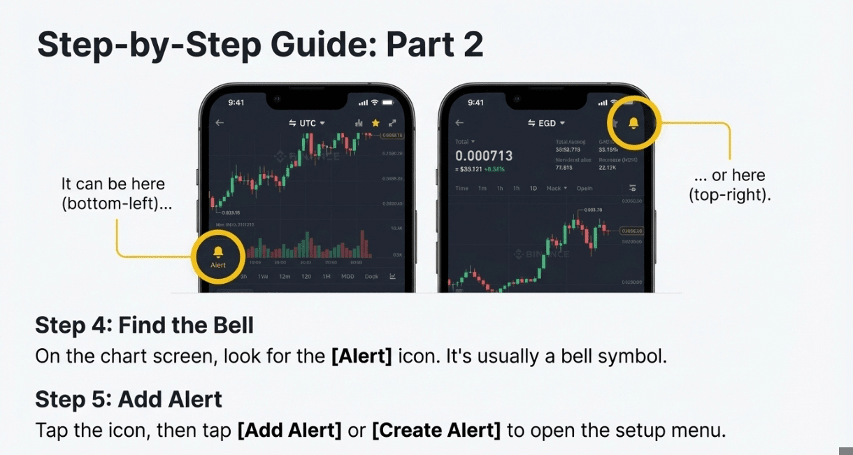A Price Alert is a digital "tripwire." You tell the Binance App: "If Bitcoin hits $95,000, send a push notification to my phone immediately."