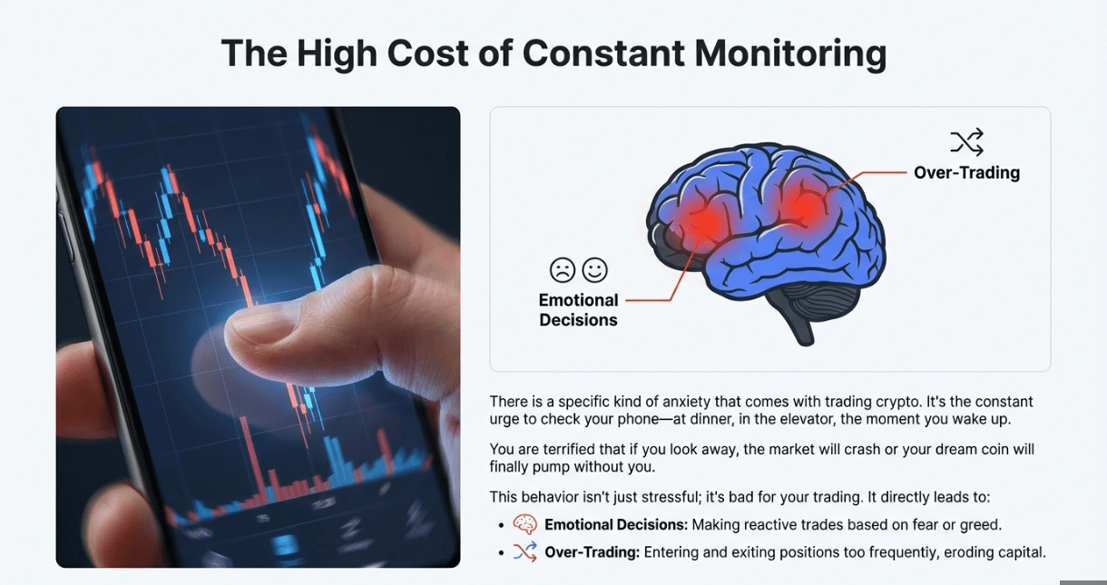 There is a specific kind of anxiety that comes while you trade crypto. It’s the constant urge to check your phone or your device. You check it at dinner, you check it in the elevator, you check it the moment you wake up and the list goes on . You are terrified that if you look away for one hour, the market will crash or your dream coin will finally pump without you (can feel you 😭) .