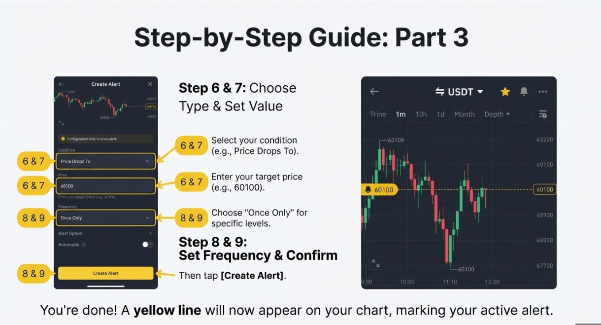 Don't Set Exact Numbers: If you want to buy at $60,000, set your alert at $60,100. This gives you a "heads up" moment to open the app and prepare before the price actually hits your level.