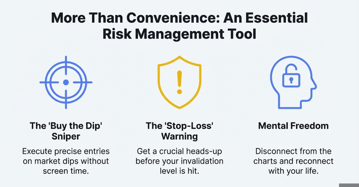 Mental Freedom: The biggest benefit is psychological. Knowing that you will be notified allows your brain to disconnect from the market. You can focus on your work or family, knowing you haven't missed anything.