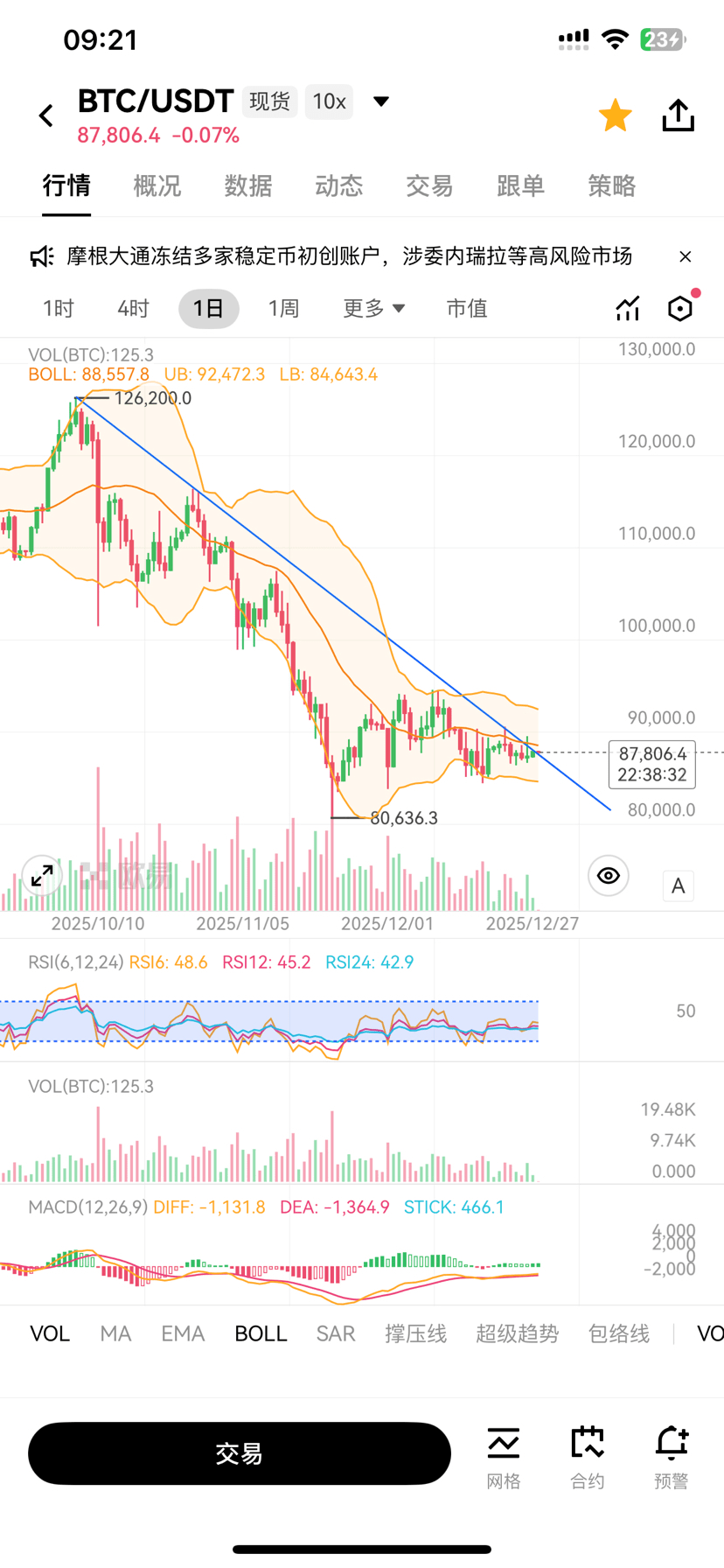 Prețul de tranzacționare: Bitcoin are în prezent un preț de aproximativ $87,000. Comparativ cu vârful istoric de $126,000 atins în octombrie 2025, prețul a scăzut cu aproximativ 30%. În weekendul din 27 și 28 decembrie 2025, Bitcoin (BTC) și piața criptomonedelor au arătat o tendință semnificativă de „decuplare” de activele tradiționale (cum ar fi aurul și acțiunile din SUA), iar sentimentul pieței a fost în general destul de scăzut, însă prețul arată semne că tendința de corecție ar putea fi aproape de sfârșit, având posibilitatea de a depăși linia de tendință zilnică în curând. Dacă reușește să depășească cu succes, și după multiple teste nu va scădea sub acea linie, atunci se poate aștepta un rebound semnificativ.