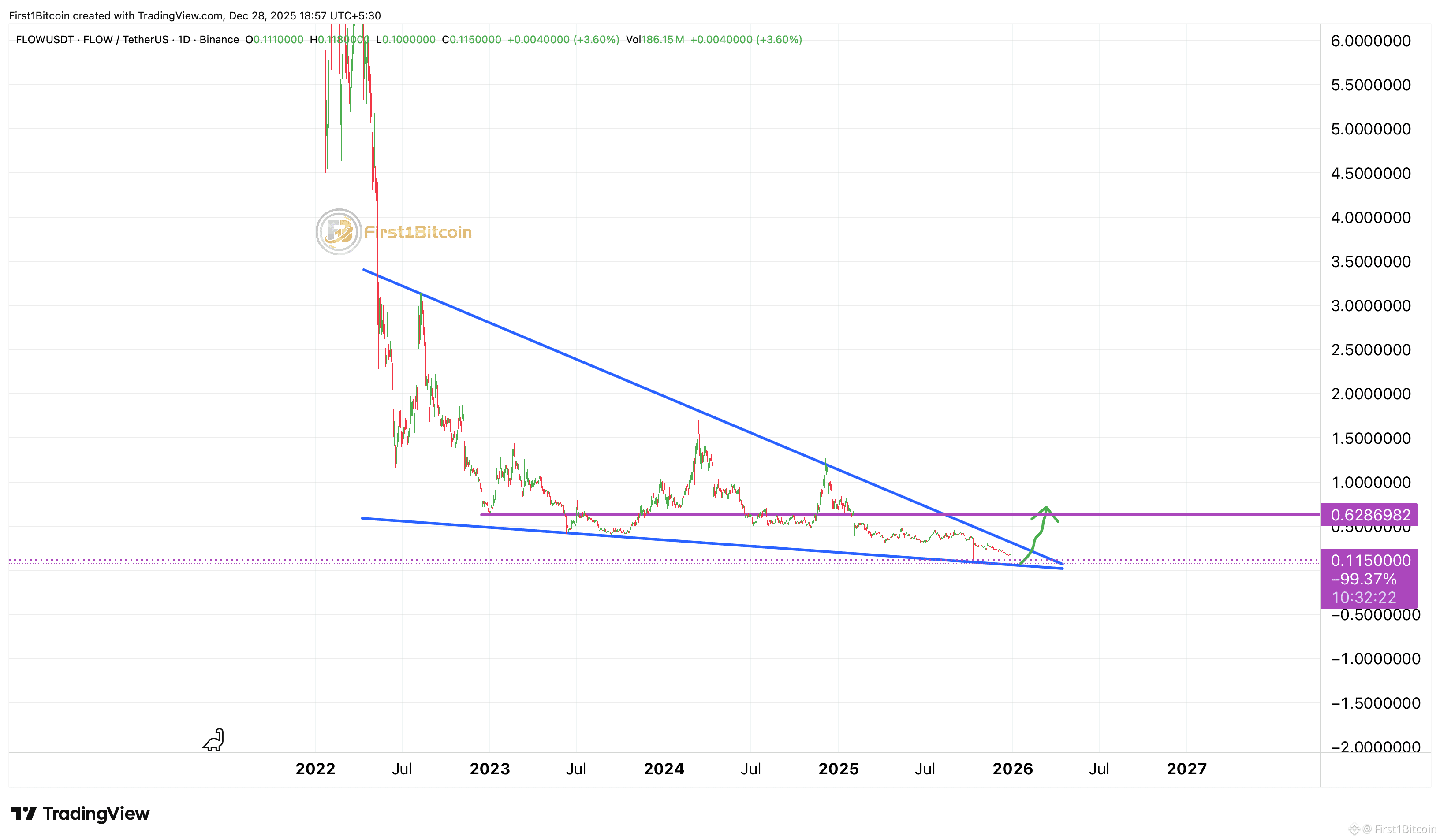 FLOW has spent years in a clean descending structure, now trading near cycle lows with volatility fully compressed.