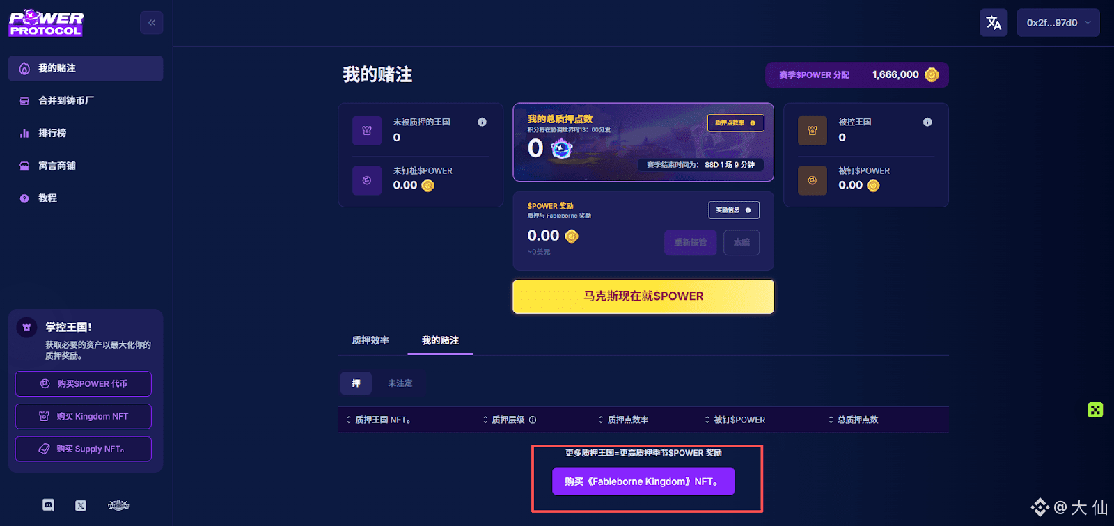 玩家可以通过购买NFT质押获取收益,赛季分配 1666000 $POWER