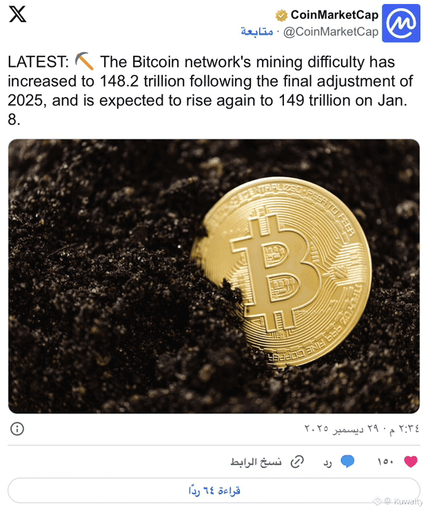 اختتمت شبكة $BTC عام 2025 بعرض حاسم للقوة التقنية، حيث ارتفعت صعوبة التعدين إلى 148.2 تريليون. يمثل هذا التعديل النهائي للعام دليلاً على استمرار مشاركة المعدنين رغم تقلبات السوق وعدم اليقين الاقتصادي العالمي. واصل المعدنون توسيع عملياتهم وتخصيص الموارد، ما يعكس ثقة تتجاوز تحركات الأسعار قصيرة الأجل. تُعد صعوبة تعدين بيتكوين الآن مؤشرًا واضحًا على الإيمان طويل الأمد بمتانة الشبكة وأهميتها المستقبلية.