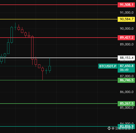 如果夜间4小时级别收不上88150上方,那说明小级别反弹没有力度,再次下跌下方支撑位留意86750-85270-83830这几个位置附近!#BTC走势分析