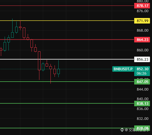 如果夜间4小时级别收不上856上方,那说明小级别反弹没有力度,再次下跌下方支撑位留意847-838-828这几个位置附近!#BNB走势